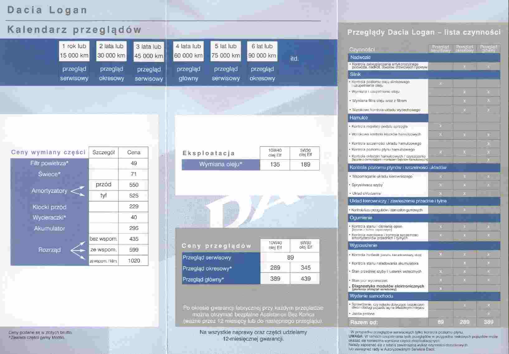 I tak dobrze, że dacia zrezygnowała z obowiązkowych debilnych niby przeglądów za ok. 100 zł. Starzy loganowcy pamiętają, że oprócz normalnych przeglądów z olejem, były jeszcze takie mini przeglądy, mechanik obszedł wóz dookoła, kasa wzięła stówę, pieczątka w książę i wio...
