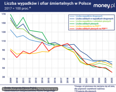 Ogólnie, od 2019 r. - czyli roku, który stanowi punkt odniesienia do porównań wolnych od efektów pandemii - do 2025 r. liczba wypadków w Polsce zmalała o 31 proc., a liczba ich ofiar śmiertelnych o 43 proc. W tym samym okresie liczba wypadków z udziałem pieszych zmalała o ponad 39 proc., a liczba zabitych pieszych o 55 proc. [...]